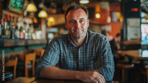 middle, aged, man, white, male, casual attire, clothing, bar, cosy, setting, indoor, relaxed, atmosphere, plaid, shirt, seating, beverage, pub, ambient, lighting, leisure, candid, mood, adult, jean, short, hair, dining, evening, socialising, friendly, background, blur, wooden, furniture, drinking, social, lifestyle, eatery, wear, beard, smiling, interior, warm, happy, stool, lamp, copy space