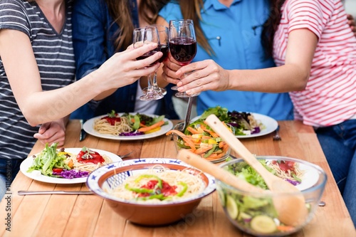 Midsection of friends toasting red wine glasses