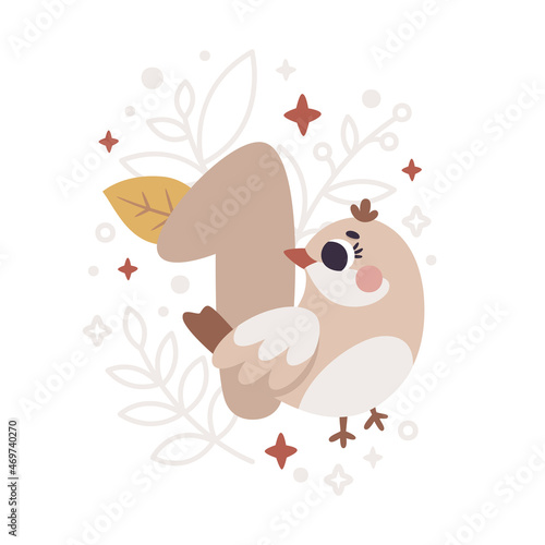 baby, 1, bird, nature, plant, symbol, signs, illustration, bohemian, capture, template, cartoon, vector, bubble, star, tree branch, leaf, berry, animal, newborn, cute, number, card, milestone