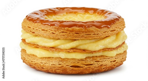 Milhojas pastry layered with custard and caramel isolated on white background for food photography and dessert use