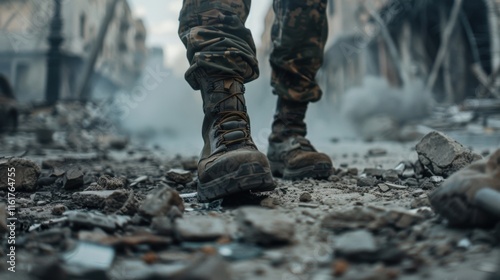 Military Boots Stepping Through Rubble in Urban Environment