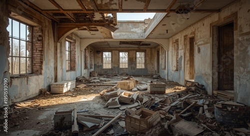 Military ruins interior showing damaged headquarters room and copy space