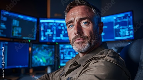 Military surveillance operation high-tech control room digital monitoring night setting close-up perspective security and strategy in focus