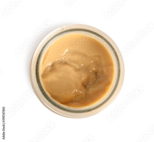 Milk pudding dessert in jar. Isolated with clipping path. Direct
