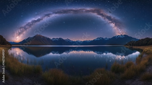 Milky Way arch over serene lake and mountains at night; scenic landscape photography
