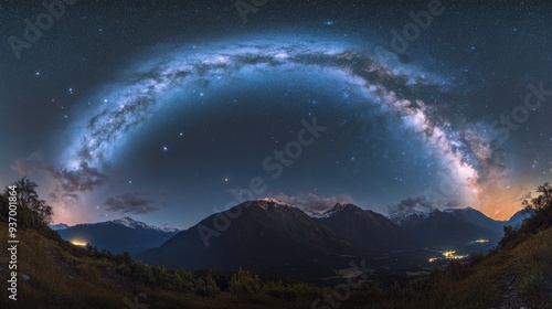 Milky Way arching over snow-capped mountains and a valley with lights at night.