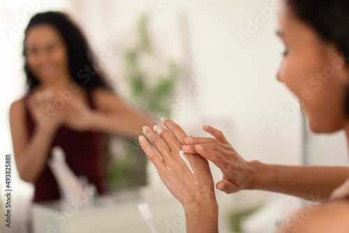 Millennial woman applying hand cream near mirror at home, free space. Spa treatment, wellness concept