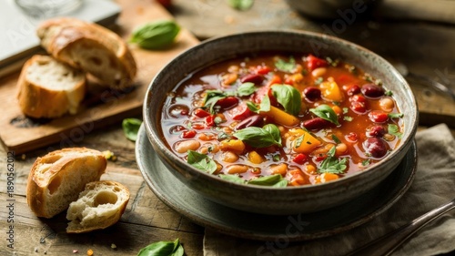 Minestrone soup with vegetables and beans. This is a hearty, healthy and flavorful dish of Italian cuisine served with crusty bread.