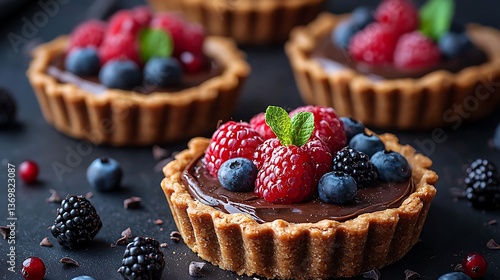 Mini Chocolate Tarts Topped with Fresh Berries and Mint Garnishes in a Dark Setting