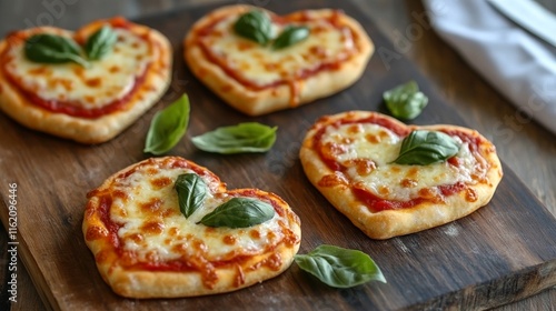 Mini heart-shaped pizzas with crispy crust, melted mozzarella, and fresh basil leaves, festive and fun for Valentine’s Day