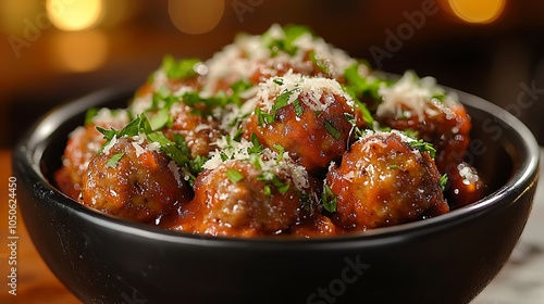 meatball, marinara, sauce, black, bowl, parsley, parmesan, bistro, background, studio, lighting, texture, colours, inviting, charming, snack, epicure, elegant, presentation, rustic, bright, wholesome, savoury, tasty, delicious, fresh, cosy, traditional, classic, italian, cookery, vibrant, layered, sophisticated, decorative, hearty