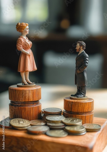 Miniature figurines of a woman and a man standing on elevated wooden platforms surrounded by a pile of coins, symbolizing economic or social disparity