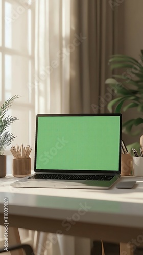 Minimaiist writeing desk set up Modern workspace setup with laptop and plants, Modern workspace with laptop green screen, minimalist home office setup, stylish laptop desk with indoor plants
