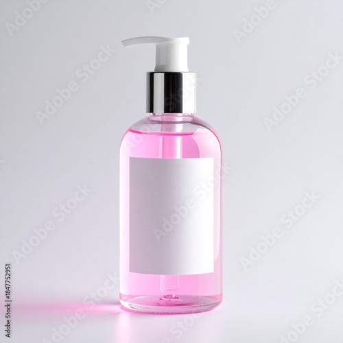 Minimal clear shampoo bottle mockup with glowing pink liquid, white label