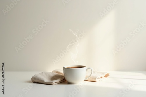 aroma, beverage, bright, calm, caffeine, ceramic, clean, hot drink, contemporary, cosy, cup, daylight, delicious, design, drink, elegance, fabric, fresh, hot, light, lifestyle, minimal, minimalism, modern, morning, natural, neat, nostalgic, peaceful, porcelain, relaxing, serene, simple, single, soft, steaming, still, style, table, texture, tidy, tranquil, warm, white, zen