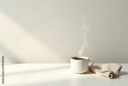 aroma, beverage, bright, calm, caffeine, ceramic, clean, hot drink, contemporary, cosy, cup, daylight, delicious, design, drink, elegance, fabric, fresh, hot, light, lifestyle, minimal, minimalism, modern, morning, natural, neat, nostalgic, peaceful, porcelain, relaxing, serene, simple, single, soft, steaming, still, style, table, texture, tidy, tranquil, warm, white, zen