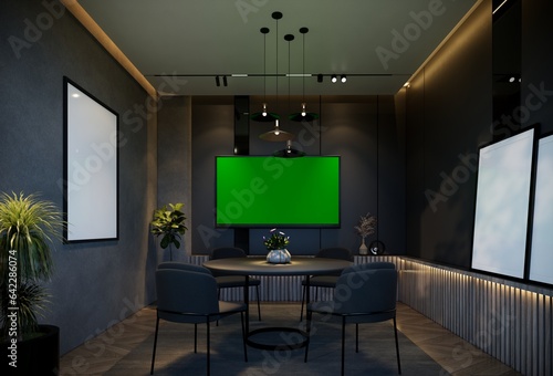 Minimal dining room interior with black tones. 3D illustration rendering