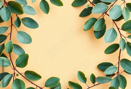 Minimal eucalyptus leaf frame on beige background, copy space, image, photo