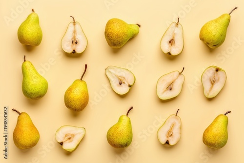 pear, pear, fruit, fresh, ripe, green, yellow, halved, sliced, cut, pattern, topview, still life, minimal, minimalist, composition, arrangement, layout, symmetry, background, beige, pastel, copy space, healthy, food, nourishment, vegetarian, vegan, organic, natural, summer, autumn, harvest, market, produce, juicy, sweet, breakfast, snack, dessert, receipe, ingredient, cooking, baking, clean, elegant, modern, texture