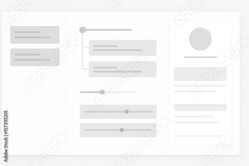 Minimal grayscale wireframe UI with user profile section, logic flow branches, control sliders, and content layout mockup for app interface design and UX structure planning