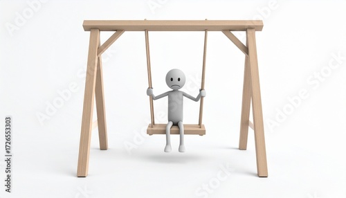Minimal humanoid figure seated on a wooden swing white background—evoking solitude, reflection, and gentle emotional suspension.