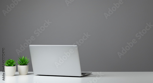 Minimal modern workspace with an open laptop computer and two small plants on a clean white desk against a gray background.