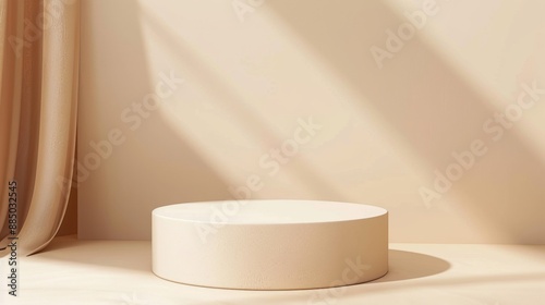 Minimalist 3D Display Stand with Soft Beige Background and Ivory Base, Featuring Shadows of Branches and Natural Green Leaves. Luxurious Cosmetics and Skincare Marketing for End-of-Season Promotions.