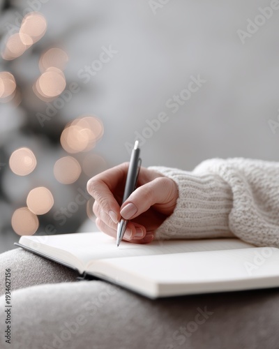 minimalist, background, professional, woman, writing, new, year, resolution, notebook, sitting, blurred, christmas, tree, motivation, future
