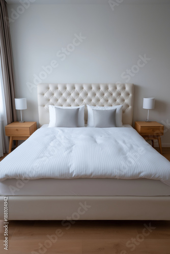 Minimalist bedroom with a tufted headboard and clean white bedding