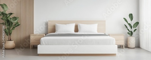Minimalist bedroom with a white bed frame and matching bedding, monochromatic design, sleek aesthetic