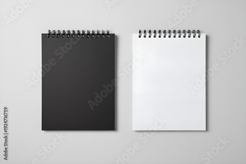 Minimalist Black and White Spiral Notebooks Mockup on Clean Light Gray Background with Soft Studio Lighting