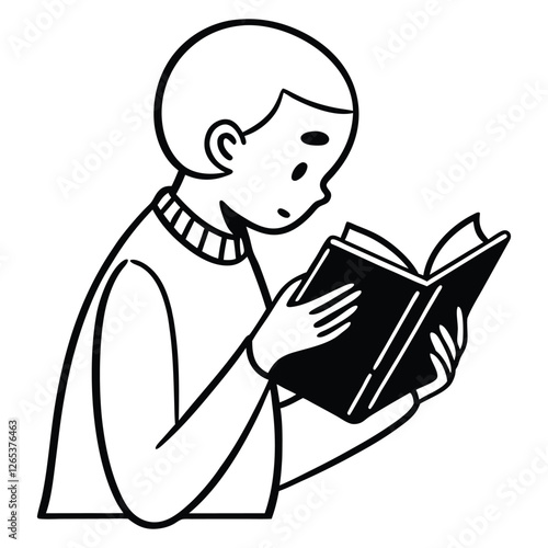 Minimalist black and white vector illustration of a young person with short hair reading an open book, depicted in a simple line art style, isolated on a transparent background.
