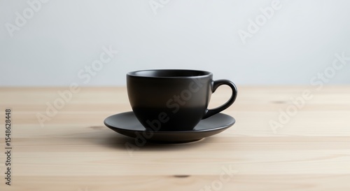 Minimalist Black Coffee Cup on Wooden Table: Serene Still Life for Morning Rituals and Beverage Concepts, Perfect for Editorial or Commercial Use
