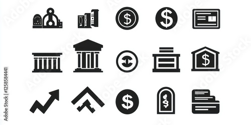 Minimalist black-and-white finance icons featuring symbols like a coin, a vault, and a banknote.