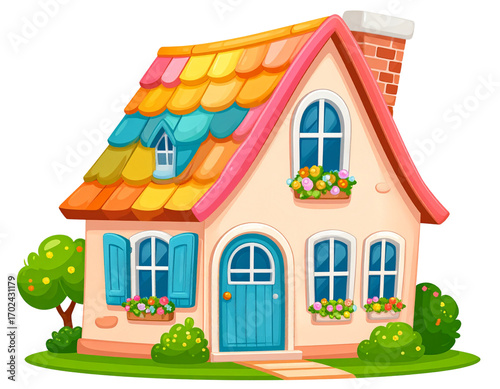 illustration, house, home, cartoon, vector, building, architecture, village, grass, landscape, estate, window, door, tree, sky, nature, roof, garden, bungalow, residential, summer, design, art, construction, real
