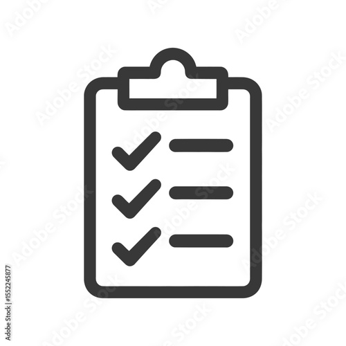 Minimalist Checklist Icon: Dark Gray Clipboard with Checkmarks and Lines on White Background