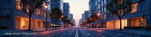 Minimalist cityscape with modern architecture and empty streets at dusk, contemporary architecture, nighttime