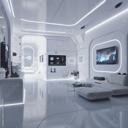 Minimalist concept interior design and user interface system inside futuristic living room area.