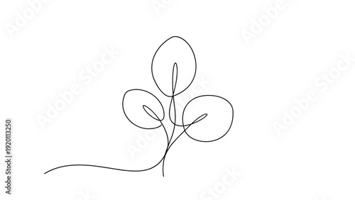 Minimalist continuous line drawing of a plant with three round leaves for simple nature inspired wall art and organic logo design.