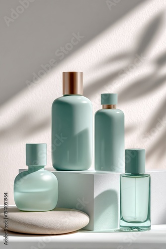 beauty, skincare, product, cosmetic, luxury, wellness, e-business, marketing, advertising, sustainability, presentation, package, container, branding, elegance, minimalism, design, style, aroma, perfume, lotion, cream, serum, treatment, freshness, clean, natural, organic, health, spa, relaxation, zen, well-being, apothecary, shadow, plant, leaf, sunlight, still life, studio, turquoise, pastel, smooth, stone, bottle, cap, cube