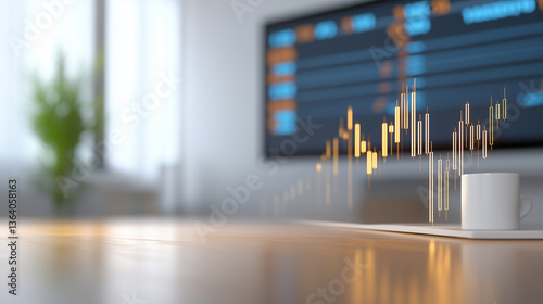 minimalist desk setup featuring financial charts displayed on a screen. a coffee cup rests nearby, suggesting a focused work environment for financial analysis.
