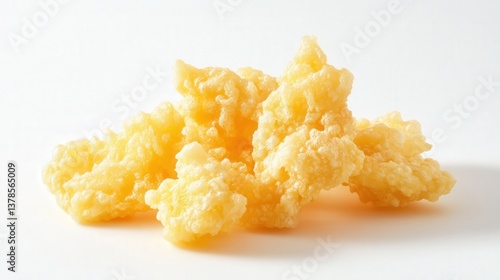 Minimalist display of golden tempura shrimp on a white background, emphasizing its crispy texture and light batter.