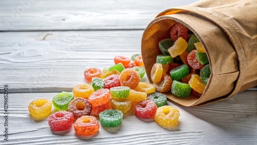 food photography, candy, sweet, treat, dessert, tropical fruit, snack, gourmet food, healthy snack, organic food, natural food, delicious, sweet, tasty, colourful, bright, vibrant, texture, still life, photo, image, background, white background, paper bag, round, ring, closeup, topview, half face, hi-res, epicure