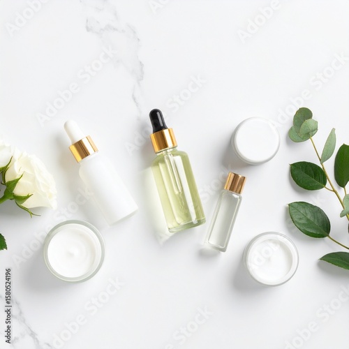 Minimalist Flat Lay of Natural Skincare Products on White Marble Background