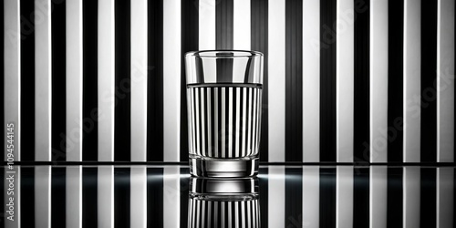 Minimalist Glass of Water on Striped Background - Elegant and Simple Photography Capturing Clarity, Contrast, and Design Aesthetics with a Focus on Transparency and Light Reflections