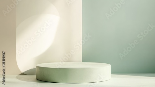 Minimalist green podium, soft light, pastel backdrop. Ideal for product display