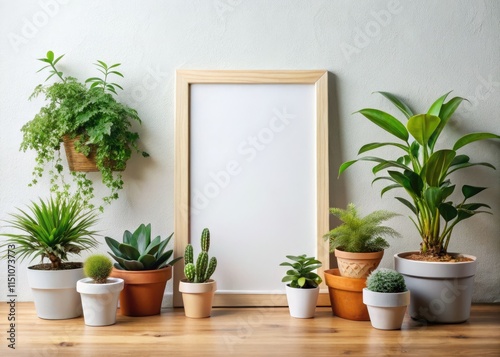 Minimalist home décor: a blank frame and lush greenery create a serene, stylish wall.
