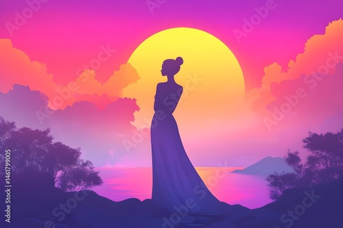 Minimalist illustration of a woman in a long tight dress, she is very beautiful and slim, she enjoys her shape on a transparent background of a colorful dreamlike and fantastical landscape