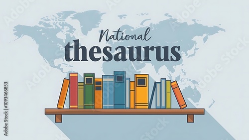 Minimalist Illustration of Books on Wooden Shelf with World Map Background for National Thesaurus Day