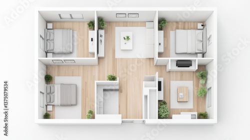 Minimalist interior design open space mindfulness. Modern interior layout of a cozy apartment featuring two bedrooms and a shared living area.